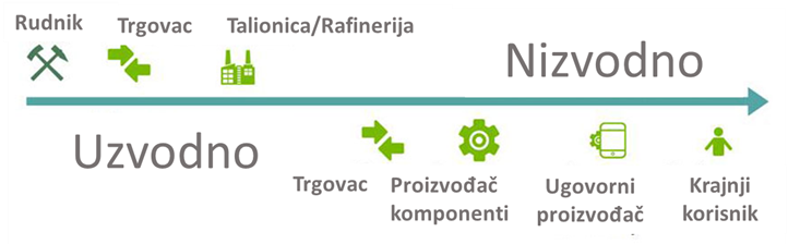 Pojmovi „početak lanca opskrbe” (eng. upstream) i „kraj lanca opskrbe” (eng. downstream) koriste se za označavanje različitih faza u lancu opskrbe mineralima i u industrijskim proizvodnim procesima. Jednostavno rečeno, tvrtke na početku lanca opskrbe posluju u fazama od rudarenja minerala do i uključujući taljenje i rafiniranje. Tvrtke na kraju lanca opskrbe obrađuju izlazne proizvode talionica i rafinerija u poluproizvode i gotove proizvode. Što je tvrtka bliže kraju lanca opskrbe, to je bliže krajnjim korisnicima i potrošačima.