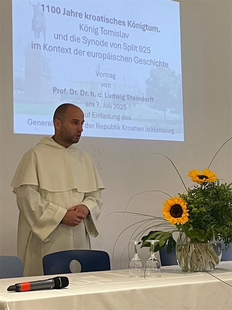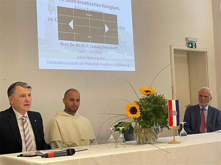 Predavanje pod nazivom „1100 godina Hrvatskog kraljevstva: Kralj Tomislav i Splitska sinoda 925. u kontekstu europske povijesti“ održao je ugledni povjesničar prof. dr. dr. h.c. Ludwig Steindorff, profesor istočne i jugo-istočne europske povijesti na Sveučilištu u Kielu. U svom izlaganju, profesor Steindorff osvrnuo se na povijesne okolnosti i važnost priznanja hrvatske državnosti u 10. stoljeću, s posebnim naglaskom na ulogu kralja Tomislava i značaj Splitske sinode iz 925. godine.