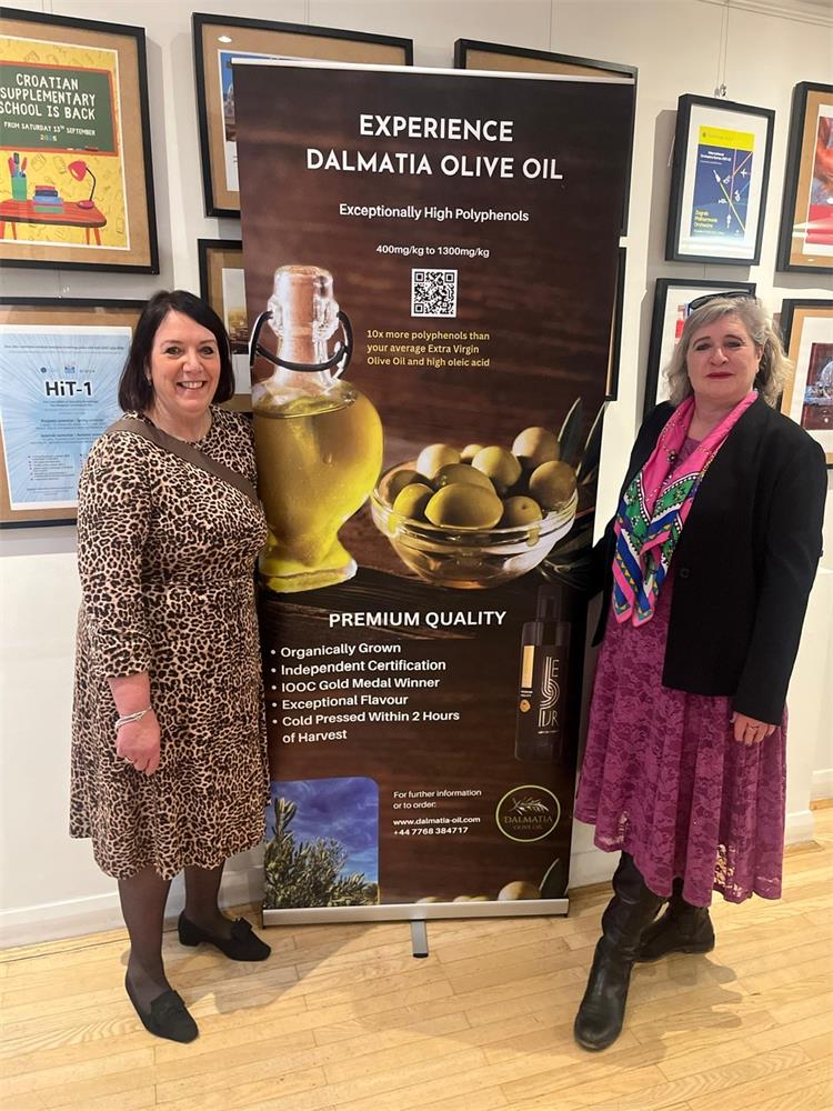 Gđa Karin Rahacek, predstavnica tvrtke Dalmatia Oil za tržište Ujedinjene Kraljevine, predstavila je tvrtku i njezina maslinova ulja, koja se ističu visokim udjelom polifenola, zajedno s gđom Fionom Jones koja je podržala organizaciju događanja. Dr. Avkash Jain, specijalist za medicinu životnog stila i direktor Cardiff Wellness Centra, govorio je o zdravstvenim prednostima maslinovog ulja s visokim udjelom polifenola, dok je sommelierka za maslinovo ulje gđa Vesna Cramer pružila stručan uvid u kušanje i kvalitativna obilježja Dalmatia Oil maslinovih ulja. Gosti su imali priliku saznati više o ulju te uživati u vođenoj degustaciji, otkrivajući iz prve ruke njegova prepoznatljiva svojstva.