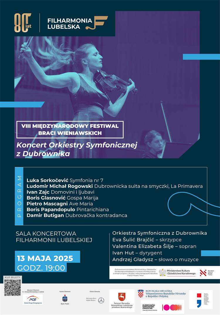 Z wielką przyjemnością informujemy, że z okazji obchodów Dnia Państwowości i Dnia Sił Zbrojnych Republiki Chorwacji, 13 maja w Filharmonii Lubelskiej w Lublinie odbędzie się koncert Dubrownickiej Orkiestry Symfonicznej, a w Warszawie 15 maja na Uniwersytecie Muzycznym Fryderyka Chopina. Podczas koncertu upamiętniona zostanie także postać wybitnego muzyka Ludomira Michała Rogowskiego, Polaka urodzonego w Lublinie, który dużą część swojego życia spędził i tworzył w Dubrowniku, uważając się za Dubrowczanina. Tego roku Dubrownicka Orkiestra Symfoniczna świętuje również swoje stulecie. Cieszymy się ze spotkania!